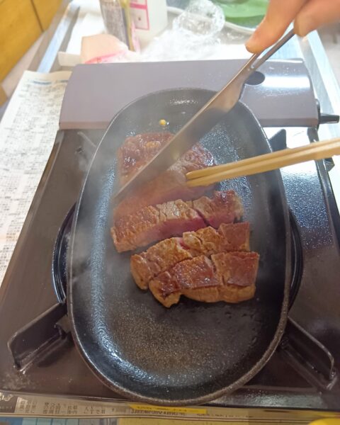 写真はとあるゲストさんがリクエストした「ステーキ」です。当日は目の前でお肉をジュージュー焼きました。「おいしいわ~。しあわせ!」と笑顔で食べるゲストさんを見て少々感慨深くなりました。