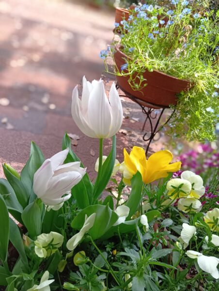 桜の季節と共にお庭のお花が咲きはじめました。正面玄関の向かい側のドアを開けるとお庭へ出ることができます。「遠くまではちょっと難しい」と思われている方も、どうぞ気軽に車イスを押しての散歩をお楽しみください。