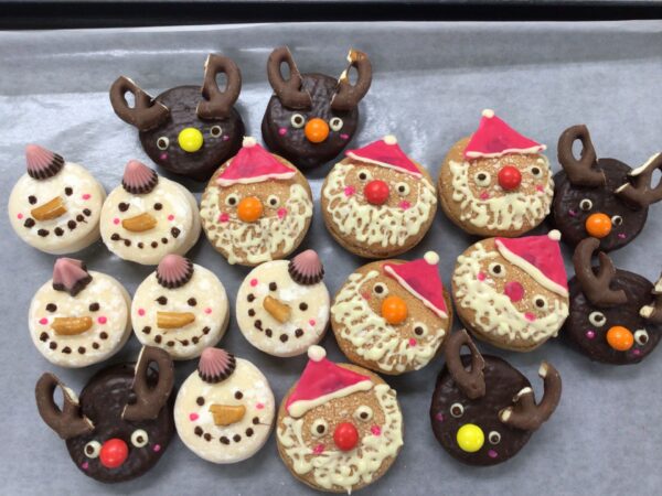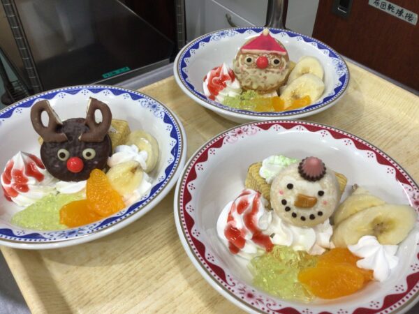 12月11日、17日、24日、25日の4日間、ロングステージKOBE大石の各階順番で、3時のおやつを手作りして楽しみました。プリン、カップケーキ、バウムクーヘンをベースにフルーツやクリームを添えて、サンタやトナカイ、雪だるまを描いたクッキーをトッピング。アポロチョコを乗せたりもしました。