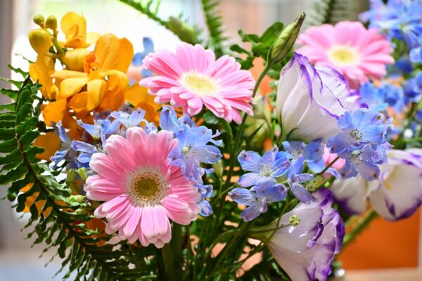 【今日は何の花】 ○ガーベラ ○モカラ ○デルフィニューム ○トルコキキョウ ○タマシダ